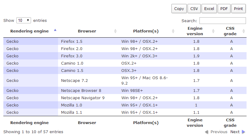 從圖片來看我們可以看到這個套件有多麼的強大,右上角也有匯出到 CSV、XLS、PDF 的按鈕,還有複製與列印功能,表格的部份也有隨時編輯功能,幾乎適用所有的瀏覽器,推薦給大家!