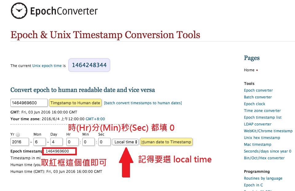 程式詳細說明: timestamp 的部份可以使用 http://www.epochconverter.com/ 轉換,記得要選 local time 本地時區,不要選 GMT 時間,因為瀏覽器是抓本地時間的,非 GMT 時間,時分秒的部份全部填 0,完成後按下 Human date to Timestamp 取 Epoch timestamp 的時間即可,true: 工作日, false: 非工作日